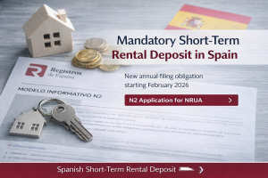 Spanien · Kurzzeitvermietungen · NRUA Verpflichtende Hinterlegung für Kurzzeitvermietungen in Spanien (NRUA): Einreichung des Formulars N2 ab Februar 2026 Wenn Sie im Jahr 2025 eine Einheitliche Registrierungsnummer für Vermietungen (NRUA) erhalten haben, sind Sie möglicherweise verpflichtet, im Februar 2026 eine jährliche informative Hinterlegung vorzunehmen. Die Nichteinhaltung dieser Pflicht kann zur