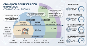 Antes de la LOTUP 2014 regía la LUV (Ley 16/2005, Urbanística Valenciana), que era la que establecía un plazo de cuatro años desde la total terminación de las obras, siempre que estas no estuviesen construidas sobre terrenos calificados en el planeamiento como zonas verdes, viales, espacios libres o usos dotacionales públicos, terrenos o edificios pertenecientes al dominio público o incluidos en el Inventario General del Patrimonio Cultural valenciano, o sobre suelo no urbanizable protegido. (art. 224)
